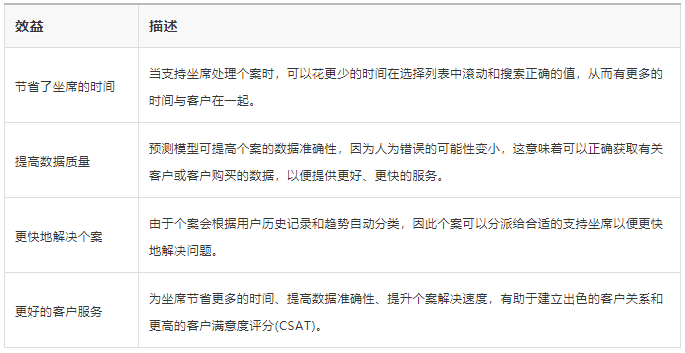 个案分类基于过去个案的数据,使用预测智能为新个案推荐或填充选择列表和复选框字段。它使用机器学习这种人工智能(ai)技术来确定个案字段的值。这种人工智能有助于保持数据的准确性,防止人为错误。它还解放了支持坐席的时间,让他们有更多的时间与客户在一起,让客户满意。